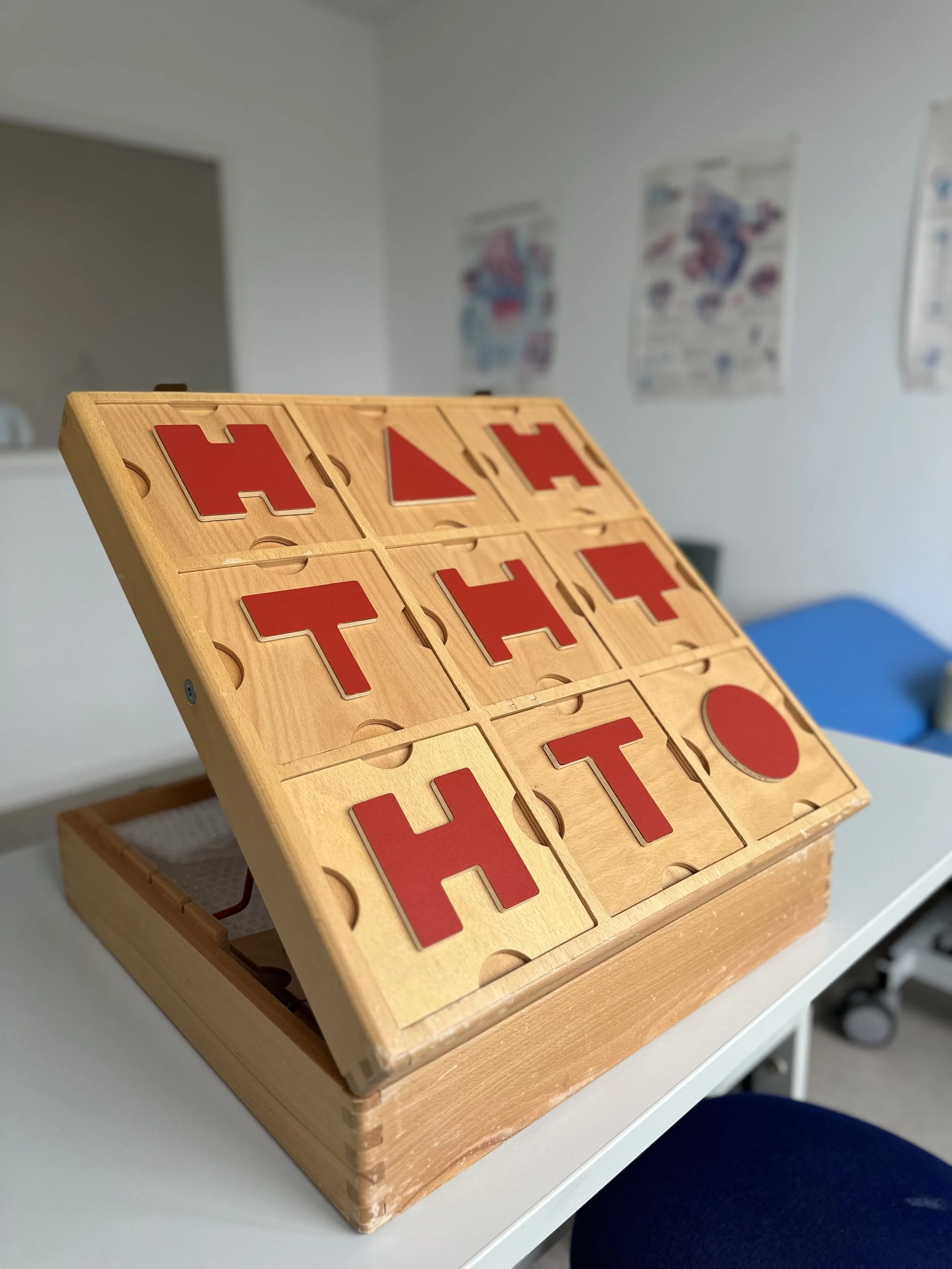 Ein Holzspielzeug mit rot-weißen Kreuz- und Kreisstücken, ein medizinisches Memory-Spiel, auf einem weißen Tisch.