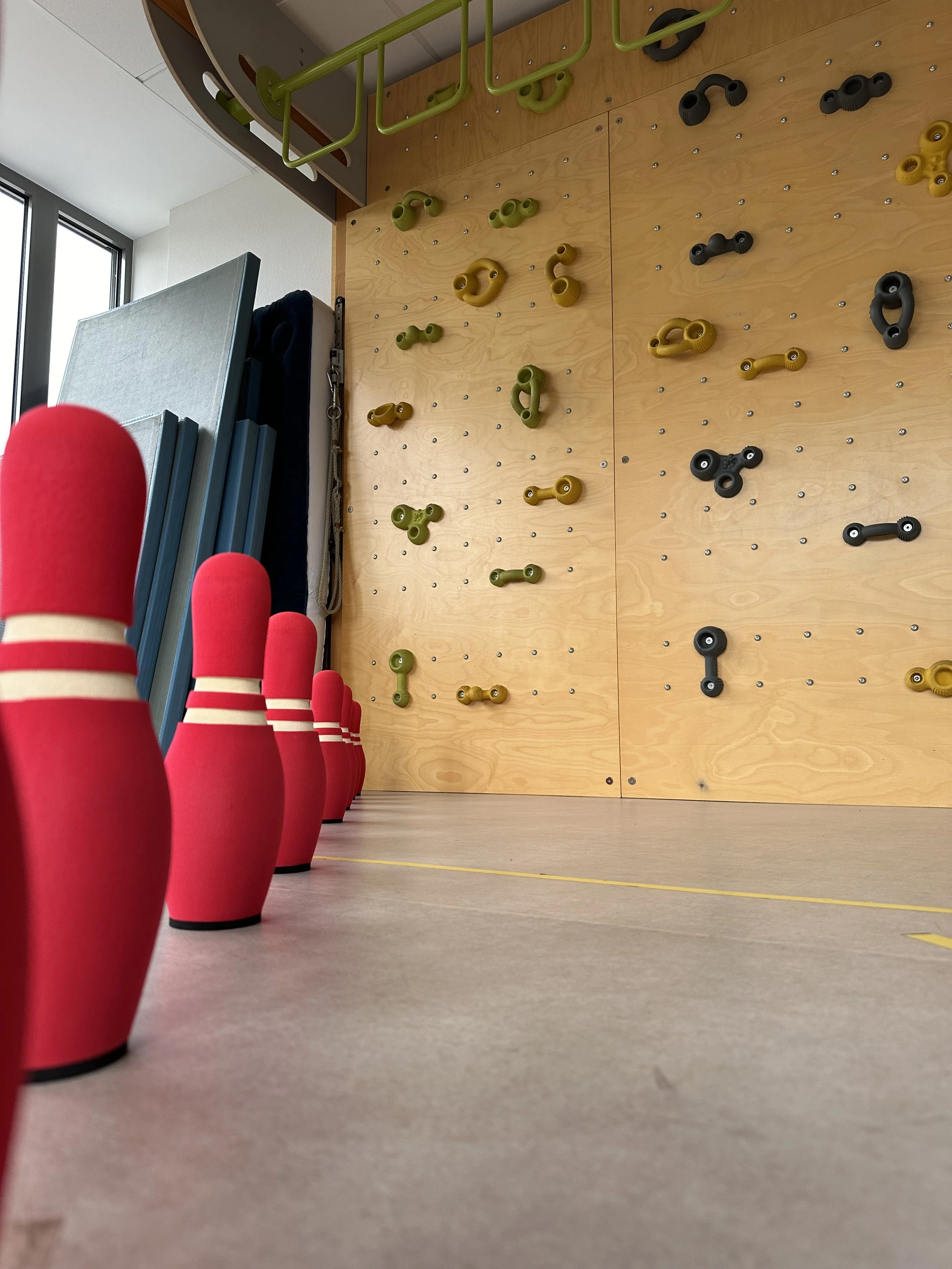 Blick auf eine Kletterwand in einem Kletterraum mit verschiedenen Griffen in Grün, Gelb und Schwarz. Vor der Wand stehen sieben rote Stoff Kegel in einer Reihe auf dem Boden.