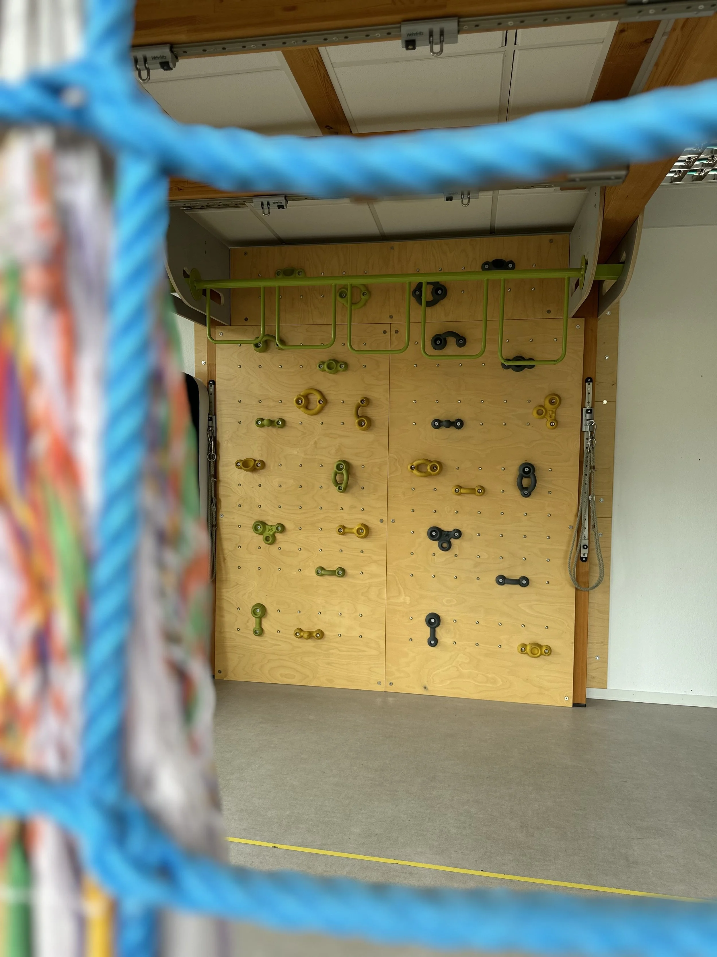 Kletterwand in einem Raum mit Holzverkleidung und einer schwarzen Sicherheitsleine, gesichtet durch ein bläuliches Kletterseil im Vordergrund.