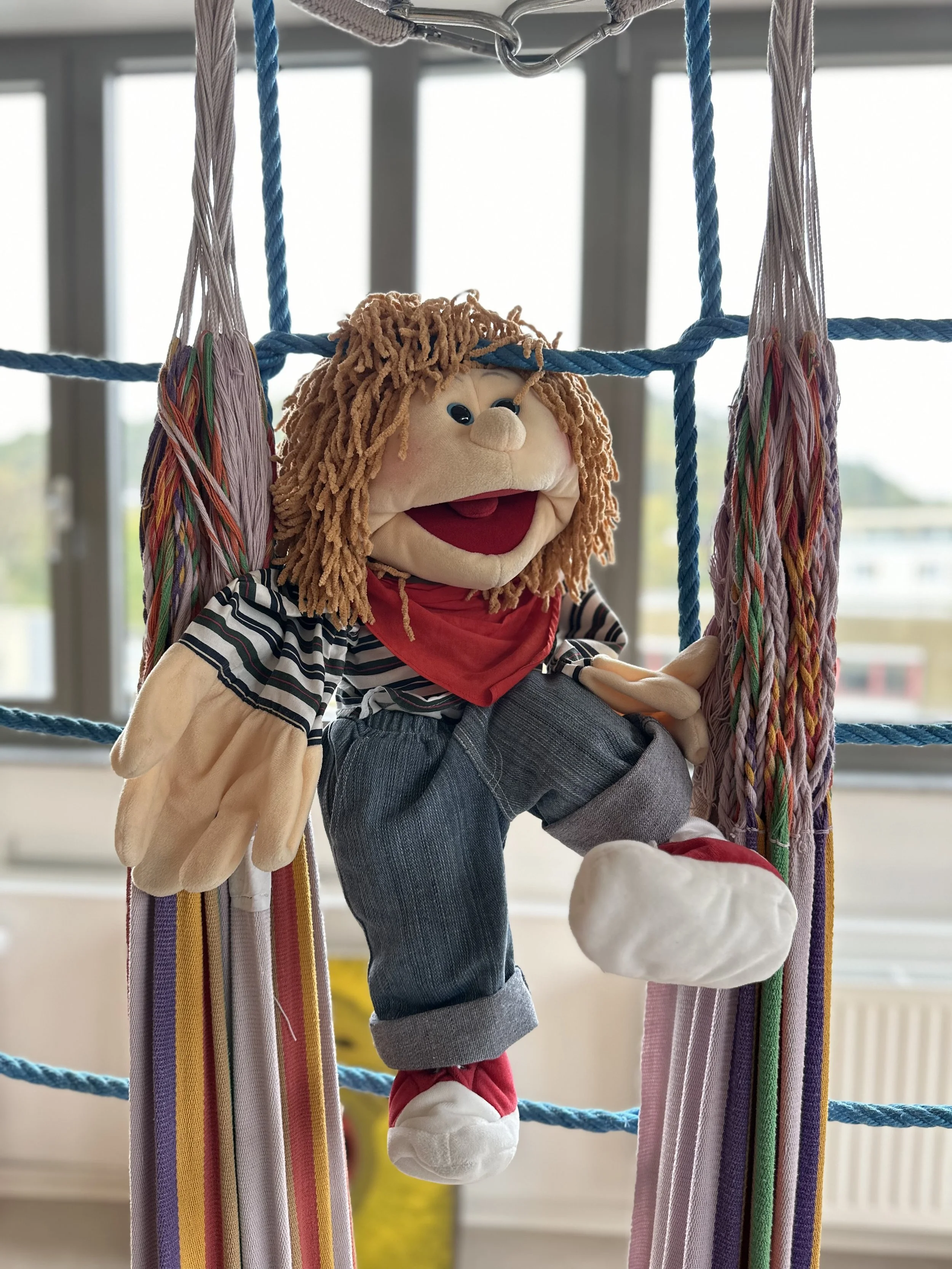 Ein Handpuppenspiel mit einem lustigen, löwenähnlichen Charakter, der an einem Klettergerüst hängt.